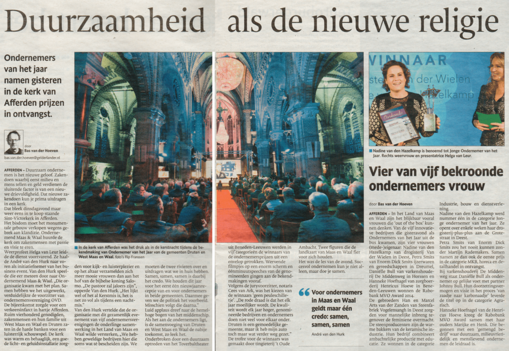 Duurzaamheid als de nieuwe religie Gepubliceerd op 5 November 2014 in de Gelderlander Ondernemers van het jaar namen gisteren in de kerk van Afferden prijzen in ontvangst.
